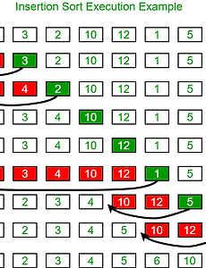 Insertion Sort는 이름에서 드러나듯 값을 어딘가(?)에 넣어서 정렬한다. 글로는 어려 울 수 있으니 간단히 Flow를 확인하면 다음과 같다.12, 11, 13, 5, 6Let us loop for i = 1 (second element of the array) to 4 (last element of the array)i = 1. Since 11 is smaller than 12, move 12 and insert 11 before 12 11, 12, 13, 5, 6i = 2. 13 will remain at its position as all elements in A[0..I-1] are smaller than 13 11, 12, 13, 5, 6i = 3. 5 will move to the b..