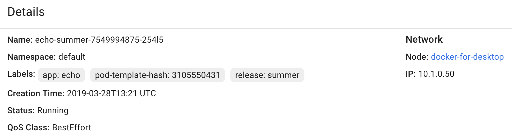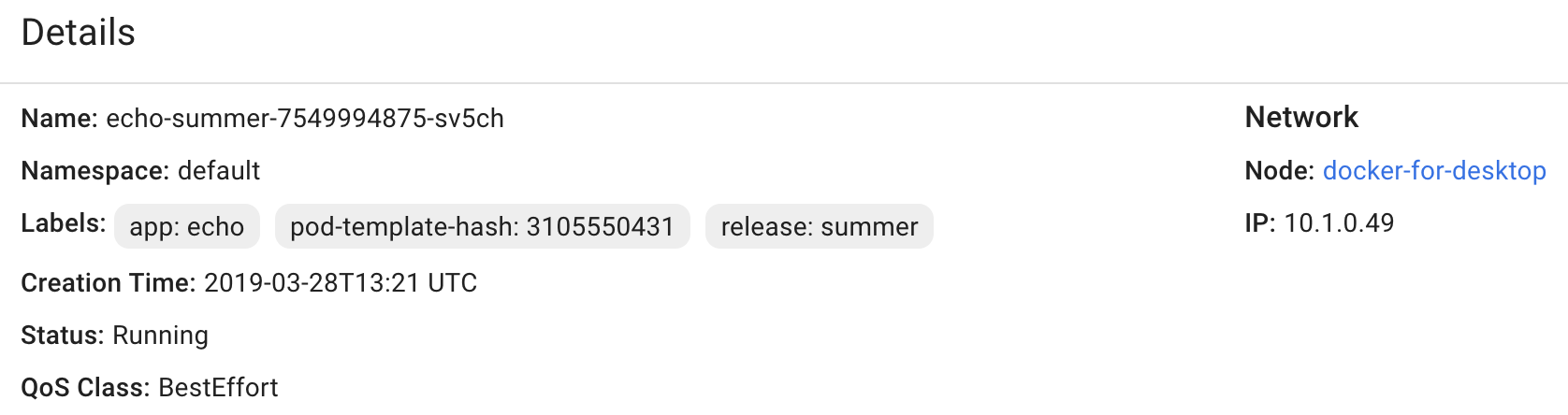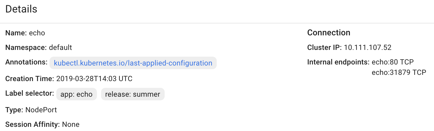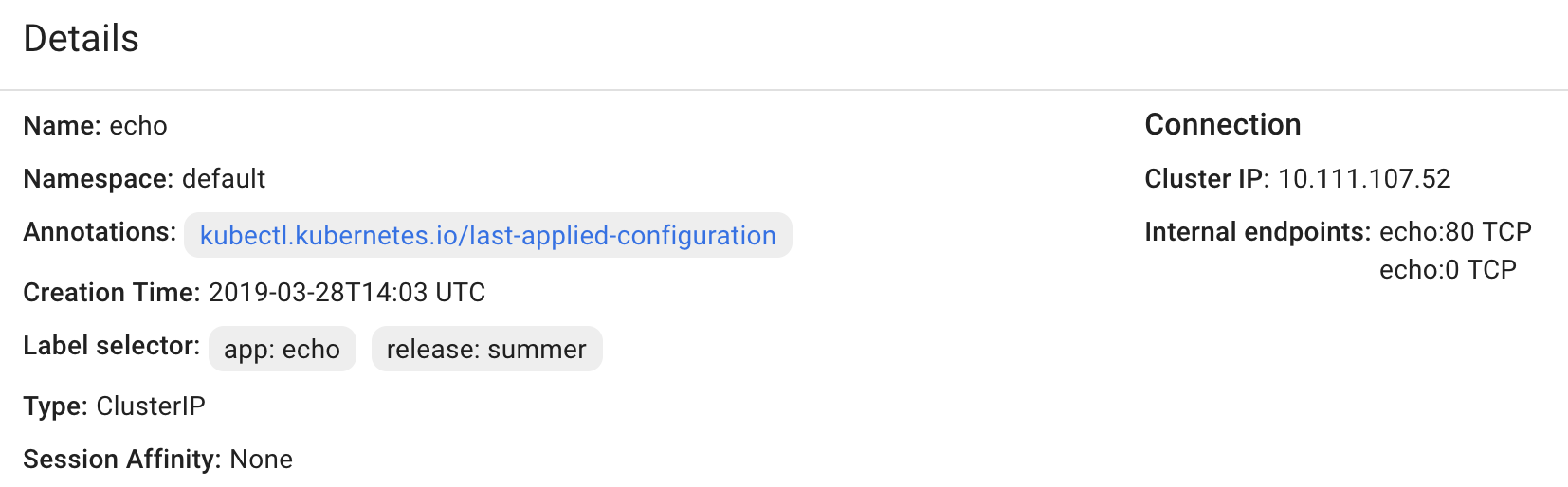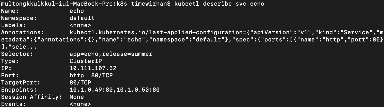 해당 Service는 Pod를 app: echo와 release: summer로서 구분한다는 정의를 담고있다.