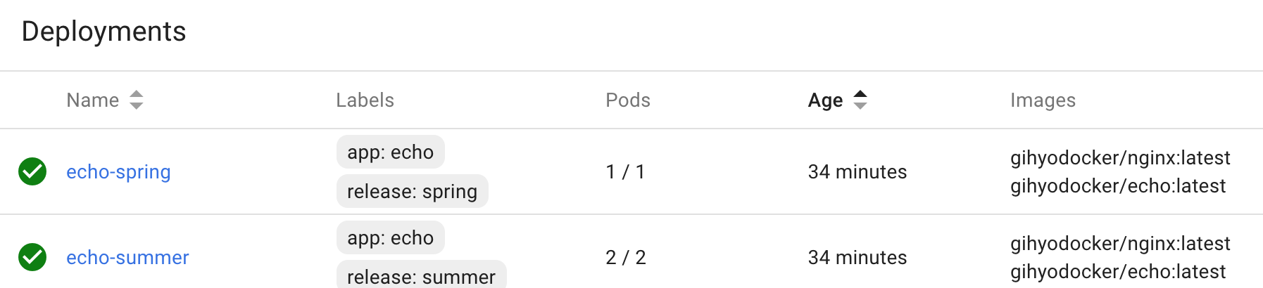 apiVersion: apps/v1 kind: Deployment metadata: name: echo-spring labels: app: echo release: spring spec: ... --- apiVersion: apps/v1 kind: Deployment metadata: name: echo-summer labels: app: echo release: summer spec: ... |