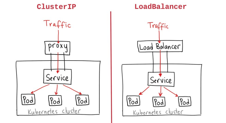각각의 개념을 간단하게 표현한 그림 10을 확인해보면 Service의 타입인 ClusterIP, LoadBalancer, NodePort의 차이를 쉽게 알 수 있다.