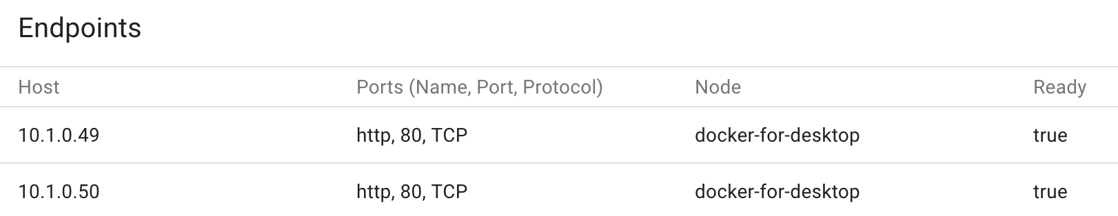 생성된 Service를 확인해보면 각 Service의 앤드포인트가 10.1.0.50과 10.1.0.49를 가지고 있는 것을 알 수 있다. 그리고 각 Pod의 할당된 IP를 보면 Service의 앤드포인트와 같다는 것을 알 수 있다. 물론 k8s cluster 내부에서 임시 컨테이터를 생성하여 Service의 name을 curl로명령*을 보내고 각 Pod에서 로그만 봐도 알 수 있다.